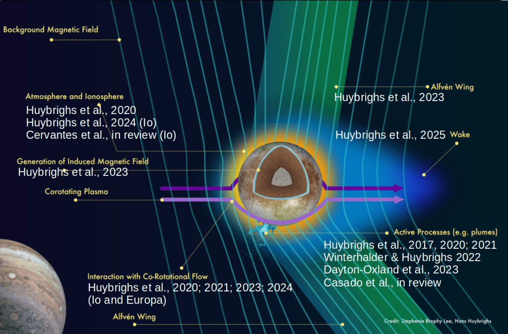 Highlighted are key first author papers of myself and my group members, and their respective connection to the various aspects of Jupiter’s moons and their environments, using Europa as an example.